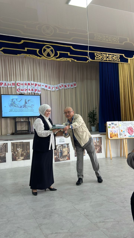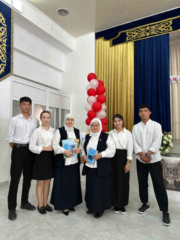 Кечеге математика китептеринин авторлору Касымов А.А. жана Бекмурзаева Б.А. катышып, мектеп жамаатына чакан белектерин тапшырышты.
