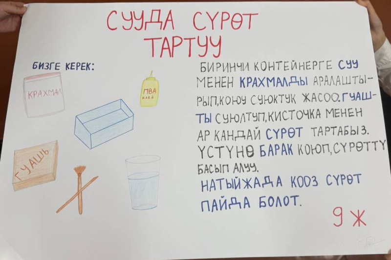 Ага Хан Фонду тарабынан уюштурулган «Мектептер-2030» проектисинин алкагында 9-ж классы “Эбру-сууда сүрөт тартуу техникасы” долбоордук ишинин “Үй шартында суу коюлтуу” темасына негиздеп чакан изилдөө ишин жүргүзүштү.