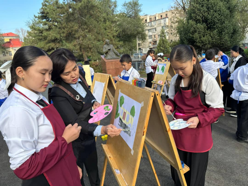 Сабактын жүрүшүндө окуучулар мальберт, боёк жана кисти сыяктуу көркөм материалдарды колдонуп мектеп имаратын, анын айлана-чөйрөсүн жана жаратылыш көрүнүштөрүн натурадан байкап, чыгармачылык аркылуу кагаз бетине түшүрүүгө аракеттеништи. Сабак учурунда санитардык-гигиеналык талаптар эске алынып, окуучулар атайын фартук, кол кап жана коргоочу каражаттарды колдонушту.