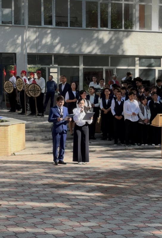 Салтанатта мектеп-лицейдин желеги 10-к классынын окуучусу Барсбек Бейшенбеков тарабынан көтөрүлүп чыкты. Ошондой эле “Манас” кошуунунун чоролору сахнага чыгып, улуттук рухту көтөргөн чыгармаларды аткарышты.