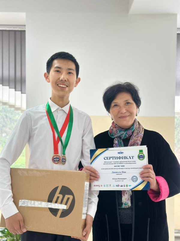 Профессор А. Молдокулов атындагы Улуттук инновациялык технологиялар мектеп-лицейинин 11-Г классынын окуучусу Пак Даниэль республика боюнча 1–11-класстардын окуучулары арасында өткөрүлгөн «ZEEN» интеллектуалдык олимпиадасында жогорку жыйынтыкты көрсөттү.